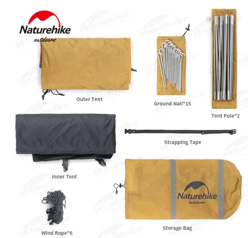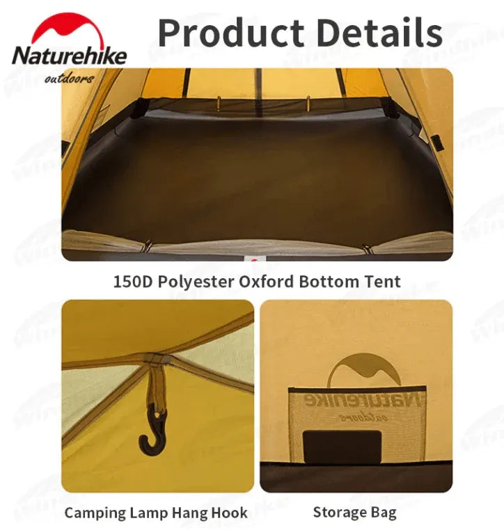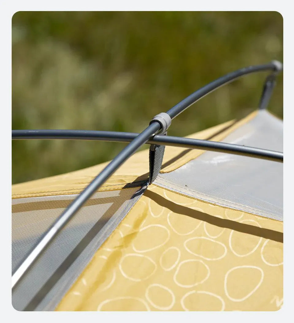 Le double-toit en polyester 210T embossé reçoit une enduction PU2000+ (environ 2 500 mm) et un traitement UPF50+ qui limite fortement la pénétration des UV. Le tissu disperse la lumière, réduit l’échauffement intérieur et protège la peau en conditions ensoleillées. Le tapis de sol en Oxford 150D à enduction PU élevée forme une cuve continue qui isole de l’humidité et des remontées d’eau. La chambre intérieure combine tissu polyester coupe-vent et moustiquaire fine 68D pour ventiler efficacement tout en bloquant les insectes. Les coutures critiques sont renforcées et étanchéifiées.